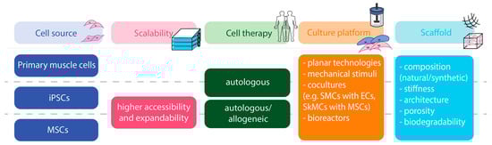 Considerations on the key points for SMC and SkMC manufacturing. From selection of cell source to culture setup, with potential combination of biomaterials. In terms of cell source, MSCs and iPSCs present broader availability and higher expansion potential, though with a limited maturation phenotype of the target cell type. Due to their low immunogenic profile, MSCs can be used in an allogeneic therapeutic setting, in contrast to primary isolated muscle cells. Concerning culture systems, a balance between complexity (e.g., cocultures that need to accommodate more than one cell type) and feasibility must be considered, with mechanical stimulus representing a critical aspect in muscle tissue engineering. Scaffold design and selection should take into account multiple characteristics such as its composition and stiffness, and if it targets in vitro/ex vivo use only, or if it is intended to be used as a cell delivery vehicle in vivo or as an architectural implanted scaffold. Adapted from [,,]. ECs: endothelial cells; iPSCs: induced pluripotent stem cells; MSCs: mesenchymal stromal cells; SkMCs: skeletal muscle cells; SMCs: smooth muscle cells.
