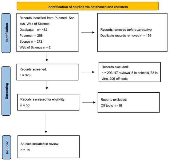 The following database yielded a total of 482 publications, including PubMed (268), Scopus (212), and Web of Science (2). After 158 duplicates were removed, 323 articles remained. A total of 293 records were excluded by analysis of the title or abstract: 47 reviews, 5 animals, 35 vitro, 206 off-topic. The reports assessed for eligibility were 30. From these, 16 articles were off topic, so they were excluded, and finally, the studies included in this review are 14 (Figure 3) (Table 1). In summary, from 482 initial articles 14 articles were used for this review.