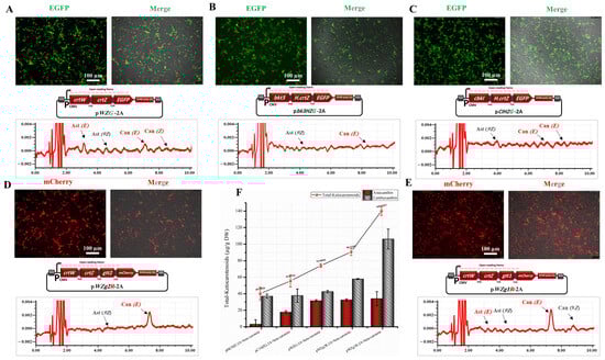 As reported in several studies, it has been proposed that the diacylglycerol acyltransferases enzyme, which is encoded by the DGTT1 and DGTT2 genes, may catalyze astaxanthin esterification in several green algae to accumulate astaxanthin monoesters or diesters, which are more stable than free astaxanthin [,]. In addition, this enzyme likely contributes to the efficient deposition of carotenoids within the cell’s hydrophobic compartments []. Therefore, the pWZg1R-2A and pWZg2R-2A plasmids were transfected into HEK293T cells separately with control and supplied with β-carotene to investigate their potential for enhancing astaxanthin production and stability. After 16 h of transfection, all specimens were imaged by fluorescence microscopy. We found that approximately 50–75% of the cells transfected with pWZg1R-2A and pWZg2R-2A plasmids revealed a high expression of mCherry fluorescent proteins, which implies the high efficiency of plasmid transfection and the high expression levels of all genes included (Figure 2D,E).