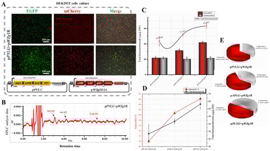 In an effort to enhance the quality of ketocarotenoids synthesized in HEK293T cells in terms of carotenoid composition by increasing the concentration of the target product (astaxanthin), we introduced the crtZ gen (encoding the β-carotene hydroxylase enzyme) to HEK293T cells within the pWZg1R-2A plasmid, an individual gene expression vector, to avoid inhibiting the function of the enzyme. This plasmid was transfected with pPYLG, pPLXG, and pAPLG plasmids separately into HEK293T cells, combined with the pWZg1R-2A plasmid, and supplied by GGPP. After 24 h of incubation, transfected HEK293T cells were imaged by fluorescence microscope, and we found that 60–75% of the transfected cells exhibited a robust expression of green and mCherry fluorescent proteins, as shown in Figure 6A. This demonstrated the effective expression of all genes involved in transfected plasmids.