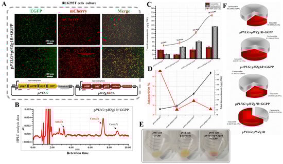 In this part of the study, we redirected GGPP flux from the animal mevalonate pathway towards astaxanthin accumulation in HEK293T cells. This was achieved by introducing the β-Car subp within the pPYLG, pPLXG, and pAPLG constructed plasmids to HEK293T cells along with the selected genes from the Ast subp (pWZg1R-2A plasmid). As shown in Figure 3A, nearly 45–65% of the cells transfected with pPYLG, pPLXG, and pAPLG plasmids along with the pWZg1R-2A plasmid showed strong expression of green and mCherry fluorescent proteins, which indicated the high efficiency of co-expression of all genes inserted upstream of EGFP and mCherry genes.