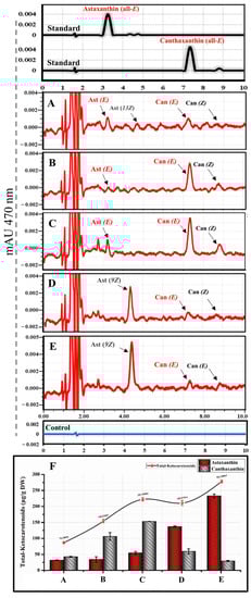 - Holtin, K.; Kuehnle, M.; Rehbein, J.; Schuler, P.; Nicholson, G.; Albert, K. Determination of Astaxanthin and Astaxanthin Esters in the Microalgae Haematococcus pluvialis by LC-(APCI)MS and Characterization of Predominant Carotenoid Isomers by NMR Spectroscopy. Anal. Bioanal. Chem. 2009, 395, 1613–1622. [Google Scholar] [CrossRef]