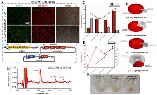 RP-HPLC data (Figure 5E and Figure 6B) confirmed a substantial improvement in the quality of ketocarotenoid composition through a significant increase in the astaxanthin content by 4.3-fold (232.81 µg/g DW), which represented 88.82% of the total ketocarotenoids (262.10 µg/g DW) in the transfected cell extracts with the pcrtZ-R plasmid compiled with pPYLG and pWZg1R-2A plasmids and supplied with GGPP, as compared to without the pcrtZ-R plasmid (Figure 5F and Figure 6C). This high astaxanthin content resulted in a distinct red coloration observed in transfected cells, as shown in Figure 6E.