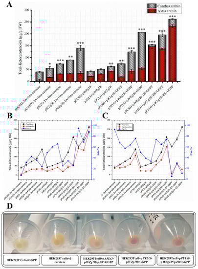 Quantitative and qualitative analytical Charts for metabolically engineered HEK293T cells using different multiple expression plasmids for astaxanthin biosynthesis. (A) Total ketocarotenoid concentration graph (including canthaxanthin or astaxanthin) from cell extracts transfected with different collections of plasmids. DW, dry weight. (B) Total ketocarotenoid concentration comparison with astaxanthin content and ratio. (C) Total ketocarotenoid concentration comparison with canthaxanthin content and ratio. Data were presented as means ± SD (three biological replicates), and a one-way ANOVA analysis was used to determine the significant differences between different approaches. p-values were calculated and represented as p < 0.05, p < 0.01, and p < 0.001 and indicated by *, **, and ***, respectively. (D) Transfected HEK293T cell pellets with red color indicate the accumulation of ketocarotenoids compared with control samples.