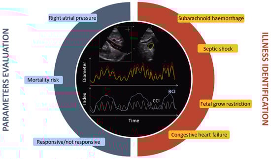 In the top and centre, there are two views of the IVC shown in red and yellow: longitudinal (left) and transverse (right). Below are the corresponding estimated diameters over time. At the bottom, the CCI and RCI parameters are shown as measurements of collapsibility. The main applications are indicated all around, divided into two sections: parameter evaluation and illness identification.