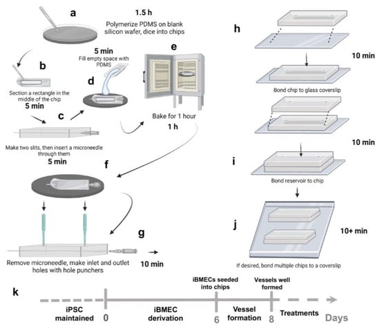 Schematic overviewing the fabrication process of our in vitro 3D vessel-on-chip model. (a) PDMS is polymerized on a blank silicon wafer and diced into chips. (b) A rectangle section is cut in the middle of the chips. (c) Two slits are made in the bottom layer and then a microneedle is inserted through it. (d) Space-filling with PDMS. (e) PDMS device baking. (f) Removal of microneedles. (g) Punching of inlets and outlets. (h) Preparation of top layer and bonding. (i) Bonding reservoir to chip (j) Multiple chips in one coverslip. (k) The iPSCs were cultured on Matrigel-coated 6-well plates and differentiation was initiated on day 0. The iBMEC-like cells were subcultured into the ECM-coated microchannels on day 6. On day 8, vessels were well formed in the channels and treatments were introduced into system. Figure was generated by BioRender.