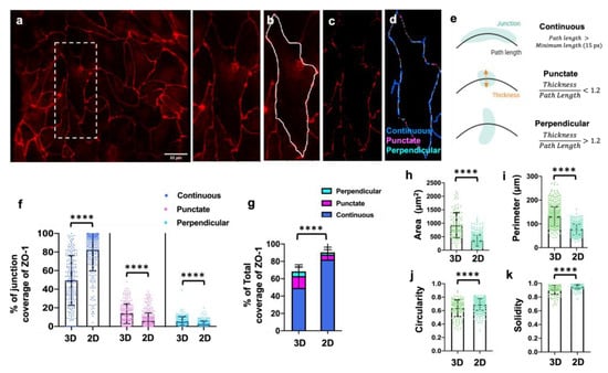 Analysis of cell–cell junctions and cell morphology in unwrapped images. (a) An unwrapped 2D image. The dotted outline box in the left image is shown zoomed in the right image of this panel. This zoomed image also corresponds to the image in panels (b–d). (b) Cell is identified by the JAnaP when the user “waypoints” a cell along its border. Once all the cells have been waypointed, the JAnaP then processes each cell. (c) In a particular cell of interest, the JAnaP will then apply a filter along the user-specified cell border to eliminate background. (d) Along the cell border, cell junctions are then classified according to the scheme indicated. (e) The classified cell junctions are displayed, and their phenotype data are saved for analysis. (f) The presentation of continuous, punctate, and perpendicular junctions for ZO-1 are shown, respectively, for 3D vessel-on-chip devices (3D) and 2D PDMS surfaces (2D). (g) The total junction coverage of ZO-1. (h–k) Cell shape factors based on ZO-1 expression. Note: 203 ≤ N ≤ 297, where N is the number of cells pooled from three biological replicates. In dot plots, each dot represents the value for one cell. Bars represent mean and error bars represent standard deviation. Statistical significance was indicated as **** p < 0.0001.