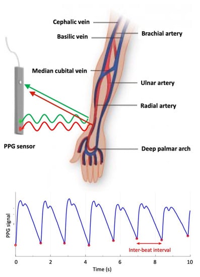 Photoplethysmography (PPG) is a non-invasive optical technique that can be used to measure the real-time variation of clinically relevant physiologic parameters and extract physiological information from living organisms. PPG takes advantage of complex light–matter interactions occurring when light at visible or near-infrared wavelengths impinges upon, and interacts with, human tissues or organs. The basic principle of PPG is that real-time changes of certain physiological parameters can affect physical processes governing the interaction of light with complex media (such as blood, skin, and bone), causing a measurable, modulated variation in the fraction of light that is either reflected and/or transmitted (Figure 2).