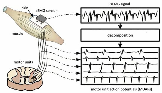 When people perform physical exercises, their muscles go through a series of dynamic contractions. Surface electromyography (sEMG) sensors are used to measure the electrical activity produced within the muscles during contraction and can provide important data about the muscle activity levels at a given time [6]. sEMG signals are essentially comprised of superimposed motor unit action potentials (MUAPs) from several motor units (Figure 4) [37]. For a thorough analysis, the measured sEMG signals can be decomposed into their constituent MUAPs. MUAPs from different motor units tend to have different characteristic shapes, while those recorded by the same electrode from the same motor unit are typically similar. Notably, MUAP size and shape depend on where the electrode is located with respect to the fibers and, so, can appear to be different if the electrode changes position.