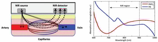 More specifically, the blood component hemoglobin scatters light, and the ratio of infrared light absorbed to those scattered changes depends on the degree of hemoglobin binding with oxygen. NIRS measures this rate of change and the change in oxygenated hemoglobin concentration. Near-infrared light having a wavelength of 700 to 900 nm is used in the optical measurement of living organisms. Visible light (wavelength 400 to 700 nm) is substantially absorbed by hemoglobin and other component organic matter, while absorption by water increases at wavelengths longer than near-infrared light. Thus, light in these wavelength ranges cannot internally penetrate living organisms. Though absorption of light in this wavelength region is caused mainly by oxygenated hemoglobin (HbO2) and deoxygenated hemoglobin (Hb), both of these have different absorption spectra, and the isosbestic point is in the vicinity of 805 nm (Figure 5) [45]. For this reason, if the molecular absorption coefficient of HbO2 and Hb is known, their concentration changes can be calculated by measuring the change in absorption at two or more wavelengths. Due to the physical principles on which it is built, an important limitation of the NIRS technology is that its light (wavelength 700 to 900 nm) penetrates only superficial layers.