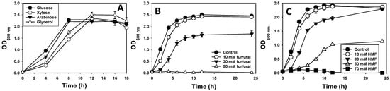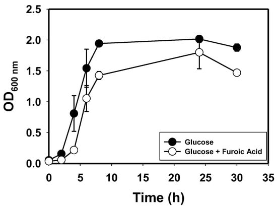 - Miller, E.N.; Jarboe, L.R.; Turner, P.C.; Pharkya, P.; Yomano, L.P.; York, S.W.; Nunn, D.; Shanmugam, K.T.; Ingram, L.O. Furfural inhibits growth by limiting sulfur assimilation in ethanologenic Escherichia coli strain LY180. Appl. Environ. Microbiol. 2009, 75, 6132–6141. [Google Scholar] [CrossRef]