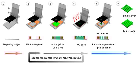 Multi-layer photopatterning has been in the spotlight for engineering micro- and nano-structures with higher resolution of up to 50 µm and flexibility in design over direct inkjet printing or micro-extrusion and micro-valve []. Photo patterning, with its high resolution and flexibility in designing parameters, does not lack printing speed and repeatability. Thus, it was an optimum fabrication method for the mass production of repeated structures. Some of the research shows the effect of porous structures; however, the structures are not well defined [,,,]. Other studies show the controlled geometry of pore and piller; however, the materials are not hydrogel, which makes it hard to encaptulate the cells [,,].