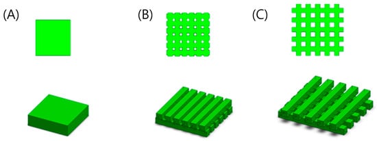 Schematic of micro-patterned porous structures using the layered manufacturing method. (A) is the control specimen that has no channel, and (B,C) have 33.3% and 53.7% porosity, respectively.