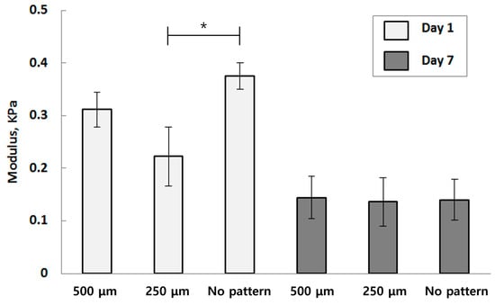 For the application in in vitro/in vivo environments, it is important for the micro-patterned porous structure to maintain its morphology during the experimental period. Five specimens were marked at each time point and fabricated as described in Section 2.4. They were then incubated in a buffer solution for seven days to test their comparative compressive modulus. The test was conducted using an Instron 4465 mechanical tester at room temperature, with a 5 kN load cell, following the guidelines of ASTM (other conditions were followed in previously conducted research) []. The dimensions of the specimens were 3.75 mm2 × 1 mm, 4.5 mm2 × 1 mm, and 5.4 mm2 × 1 mm for specimens with no pattern, 250 μm pattern, and 500 μm pattern samples, respectively. A schematic diagram of the compressive stress test is shown in Figure 3.