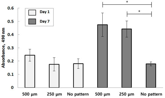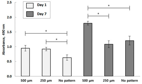 On Day 1, as expected, substrates with 500 μm and 250 μm spaced patterns exhibited a higher absorbance rate than the control. The micro-porous channels may have acted as pathways for the staining agent to reach the cultures, resulting in a 42% higher absorbance rate. When comparing the Day 1 results with the final result on Day 7, it is clear that the absorbance rate increased over time.