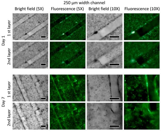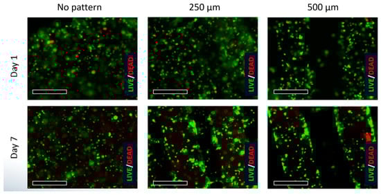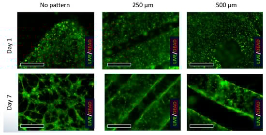Characterization of embedded HUVEC cells’ behavior in micropatterned structures stained with the IVE/DEAD assay (the scale bar indicates 500 μm).