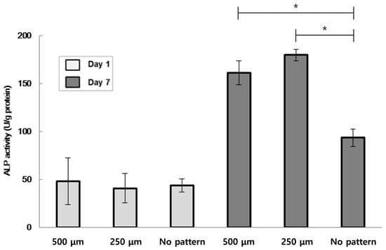 ALP activity of the W-20-17 cell-laden patterns (Each value represents the mean ± SD (n = 5, * donates significant difference (p < 0.05)).
