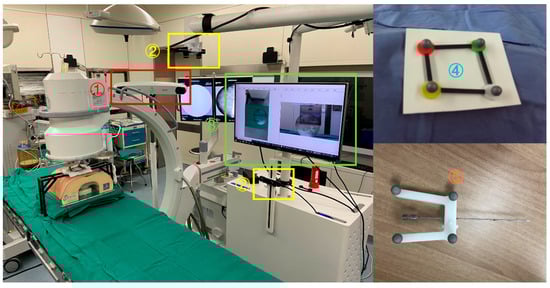 The AR-MISS system consists of a hardware system, a location kit, and self-developed software (version V1.0). The hardware system includes an infrared positioning device (Polaris Spectra, NDI, Waterloo, ON, Canada), two depth cameras (ZED Mini, Stereolabs, San Francisco, CA, USA), and a workstation with a monitor. The location kit includes custom-made noninvasive fiducial markers and a puncture needle locator. The system was implemented with a C-arm (Brivo OEC 715, GE, Boston, MA, USA) in the animal-specific operation room with lead protection (Figure 1). The workflow of the system is shown in Figure 2.