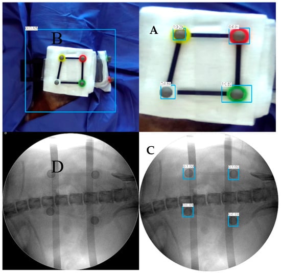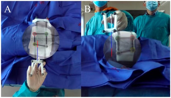 The AR-MISS system has an AR radiograph superimposition function. The noninvasive AR fiducial markers were placed on the animal’s back and flank in the horizontal direction and perpendicular direction via the radiolucent bracket (Figure 3A). The side length of the fiducial markers ranges from 55.0 mm to 66.5 mm. The anteroposterior (AP) and lateral radiographs were taken and exported to the AR-MISS system. Real intraoperative videos of the posterior and lateral positions were also simultaneously captured by two binocular depth cameras and transmitted to the system in real time (Figure 4A,B). To ensure consistent magnification ratios between the fiducial markers in the C-Arm and those in the video, it is crucial to position the light source of the C-Arm and the camera on the same side, ideally in the same location.