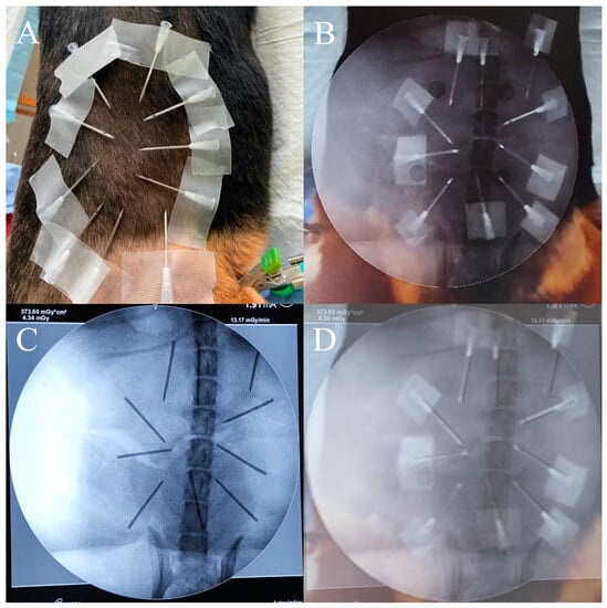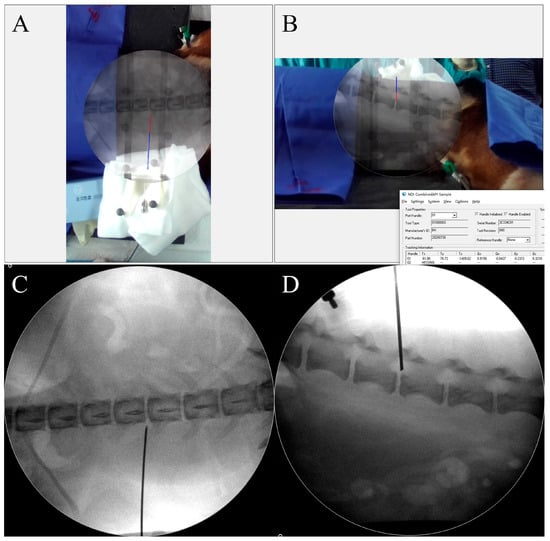 To evaluate the precision of the AR radiograph superimposition, 10 needles were fastened on the beagles’ backs and sides (Figure 5A). The positions of the needle tips in the AR radiographs were captured (Figure 5B). Radiographs were obtained to capture the real positions of the needle tips in the real radiographs (Figure 5C). We overlaid the AR radiographs (including real needles and AR spine) with the real radiographs (including needles and spine in the radiographs) by registering them through the spine, and the positions of the needle tips in the AR radiographs and in the real radiographs were compared (Figure 5D). The distance error of the needle tip and the angle error of the needle were measured. A total of 20 experiments were completed. For each group, 10 syringe needles in the AP radiograph and the lateral radiograph were evaluated.