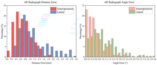 The error distribution diagram of AR radiograph superimposition. The distance errors were distributed mainly from 0 to 2.0 mm, and the angle errors were distributed mainly from 0 to 2.6°.