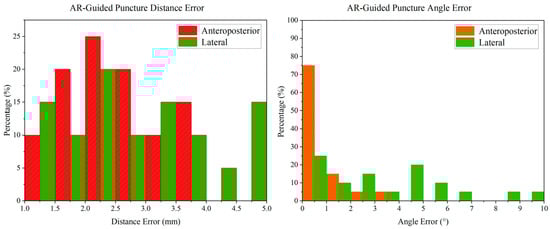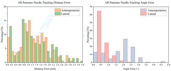 Before puncture, the puncture needles were tracked and shown in the real intraoperative videos successfully. The accuracy of the AR real-time puncture needle was evaluated by the tracking experiment. The tracking distance error distribution diagram and angle error distribution diagram are shown in Figure 9. The distance errors were distributed mainly from 0 to 2.4 mm, and the angle errors were distributed mainly from 0 to 3°. The AP tracking average distance error was 1.26 ± 0.20 mm, the lateral tracking average distance error was 1.22 ± 0.25 mm, the AP tracking average angle error was 1.87 ± 0.81°, and the lateral tracking average angle error was 0.47 ± 0.13°. In addition, the latency of the tracking procedure of tracking was approximately 0.2 s.