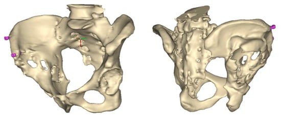 A 3D pelvis reconstruction allowed further processing using the Mimics Innovation Suite (Materialize NV, Leuven, Belgium), which is an engineering software package that enables 3D medical imaging and surgical-related planning. So, the design of the patient-specific aiming device was based on a 3D reconstruction of the patient’s own anatomy. After importing and transforming the two-dimensional Digital Imaging and Communications in Medicine (DICOM) standard file, the radiation absorption range was selected using the windowing method for spatial imaging of the reliable bone structure (Figure 1).