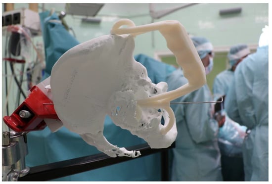 Despite its history of only a few years, augmented reality is already being used in several surgical applications, with a variety of experimental solutions for the overlaying of 3D virtual space and real anatomical structures, the so-called registration, but the accuracy still typically varies between 3 and 6 mm, which is not sufficient for the higher precision procedures in question []. The procedure described above requires the registration process to be performed using a high-precision 3D scanner with sub-millimeter accuracy [,].