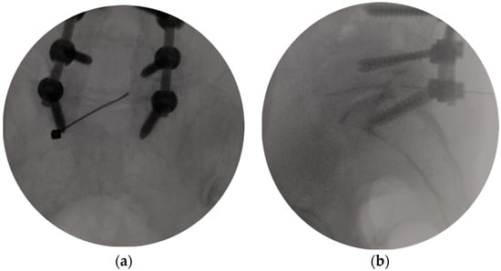 All patients underwent diagnostic selective nerve block before the operation to define the nerve root responsible for the patient’s persistent pain. Because of FS and the obstruction of internal fixation and bone graft, the L5 nerve block was difficult to perform through the transforaminal approach. Therefore, all selective nerve blocks were performed through an interlaminar approach. Patients were positioned prone on a radiolucent table. A 20-G Tuohy needle was introduced into the midline at the level of the pathology and was advanced toward the superomedial margin of the interlaminar foramen until it touched the bone. The needle was pushed forward along the bone until the tip was located at the line of the medial border of the pedicles in the fluoroscopic anteroposterior (AP) view (Figure 1a) and the inferior posterior margin of the superior vertebral body in the fluoroscopic lateral view (Figure 1b). After confirming the final position of the needle tip, 2 mL of Ioversol was injected, and the diffusion range of the contrast agent was evaluated. Then 1 mL of 0.5% lidocaine and 1 mL (40 mg) triamcinolone acetonide were injected into the epidural space. The injection was deemed diagnostic if the typical pain could be reproduced with the advancement of the needle and initial injection of contrast agent consistent with the corresponding dermatome of the symptomatic nerve root and pain relief within 2 h after the injection while asking the patient to perform the provocative maneuver or activity that typically would elucidate their familiar pain.