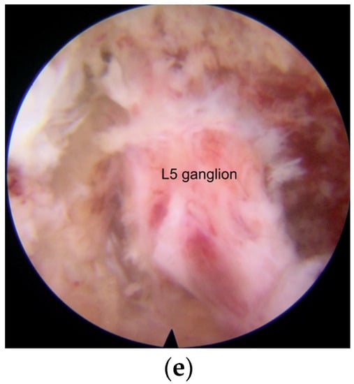 Further decompression was performed under the endoscope view with endoscopic Kerrison punch, drill (Spinendos GmbH, München, Germany), or ultrasonic osteotome (SMTP, Beijing, China). The lateral foramen was decompressed by removing the medial part of the facet and undercutting the lateral aspect of the facet until the outer lateral part of the foramen was seen. Then, the soft scar tissue was accessible to be detached from the bone. The space between the L5 and S1 pedicles on the symptomatic side was visualized. The origin of the exiting nerve root was revealed by sometimes removing the dorsal part of the L5 lateral recess and the medial and inferior parts of the L5 pedicle. The lateral aspect of the dura and the dorsal aspect of the L5 nerve root and dorsal root ganglia (DRG) were exposed. The space underneath the root was probed with a small hook dissector. Finally, the shoulder, the axilla, and the dorsal aspect of the L5 nerve root were adequately decompressed (Figure 2e). Pressure could be changed by the intermittent block of the irrigation saline outflow with the thumb, allowing the exiting nerve root to move freely, confirming complete decompression. After adequate hemostasis with a bipolar radiofrequency electrode (Elliquence LLC, New York, NY, USA), the endoscope was withdrawn, and the incision was sutured subcutaneously with an absorbable suture.