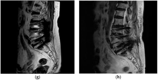 All the patients were mobilized the morning after surgery and discharged after postoperative MRI and CT performed one day after surgery (Figure 3). A lumbar brace during mobilization was prescribed for about four weeks. Some exercises, including isometric and coordinative exercises, were guided by rehabilitation doctors before surgery and were performed without supervision after surgery. No physical therapy was prescribed. Oral administration of meloxicam as a 7.5 mg tablet for one week was prescribed. Symptom relief was evaluated by follow-up interviews at preoperative and day one, three months, six months, 12 months, and 24 months after surgery. Low back and sciatica pain was measured using a visual analog scale (VAS) score (1–100). Functional outcomes were assessed by using the Oswestry Disability Index (ODI) (preoperative, three months, six months, 12 months, and 24 months after surgery) and modified MacNab criteria (2-year follow-up). The preoperative and postoperative heights and widths of the pathological foramina and the posterior disc heights at L5–S1 were obtained from sagittal CT views []. Statistical analyses were performed with Statistical Package for Social Sciences 26 software (IBM Corp., Chicago, IL, USA). Preoperative and postoperative VAS scores of low back sciatica pain and ODI values were analyzed with ANOVA. Preoperative and postoperative heights and widths of the pathological foramens were analyzed using Student’s t test. p < 0.05 was considered a significant difference.