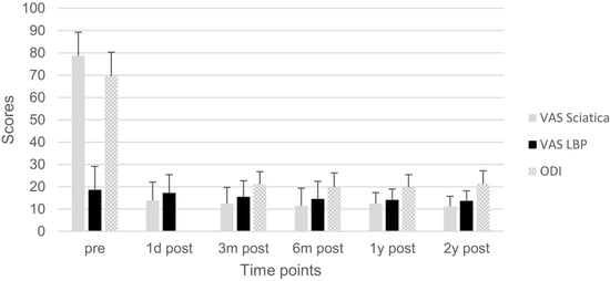 Clinical outcomes. Visual analog scale (VAS) scores for sciatica pain and low back pain preoperatively and at one day, three months, six months, one year, and two years postoperatively. Oswestry disability index (ODI) preoperatively and at three months, six months, one year, and two years postoperatively.
