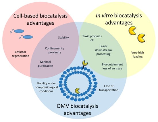 Despite these challenges, these methods may provide an ideal alternative to whole-cell biocatalysts and some of the inherent issues associated with those systems. Export or “off-loading” of recombinant enzymes in vesicles could circumvent problems of toxicity due to accumulation of recombinant proteins or the catalysts and formation of products that could impact cellular viability. These biological nanoreactors have been shown to be functional in several chemical reactions including biomass degradation [] and as potential tools for bioremediations directly from bacterial cultures as shown by Alves et al. []. These OMVs can be concentrated in a reaction vessel to increase efficiency of product generation or stored for use at a later date or for transport to be used at a location different from that of production. This might be particularly important for the transport of these bioremediation agents to extreme hot or cold environments where recombinant enzymes or whole cell-based catalysts may not work. The advantage of accessibility to substrates would be maintained for surface-anchored enzymes, and the possibility also exists for producing OMVs with target enzymes anchored at their internal surface or contained in their lumen. In this case, use of permeabilization agents to increase substrate access may be less detrimental to OMVs than it would be to whole cells. Overall, use of MVs in biocatalysis has been shown to be a promising avenue for biosynthesis, biosensing, and bioimaging.