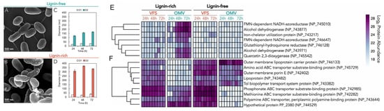 Beyond polysaccharides, other polymers within plant biomass, including lignin, a class of cross-linked phenolic polymers, are difficult to break down for nutrient sources or other uses. While lignin had previously been shown to be depolymerized in nature by various fungal species, recently Salvachúa et al. showed that bacterial OMVs, too, can break down lignin []. By conducting proteomic analysis under various conditions of the saprotrophic soil bacterium Pseudomonas putida KT2440, they showed that when grown in lignin-rich media, putatively ligninolytic enzymes such as de-colorizing peroxidases are significantly enriched in the exoproteome relative to intracellular proteins. In addition, they identified other enzymes that they hypothesize modify both oligomeric and monomeric aromatic or phenolic compounds, including a 2,3-quercetin dioxygenase, a xenobiotic reductase, and azoreductases, each of which was enriched in the P. putida exoproteome in lignin-rich media. Regarding OMVs, they showed that two distinct populations of OMVs develop in lignin-rich media—as determined by diameter measurements with transmission electron microscopy, suggesting a large corresponding phenotypic shift by P. putida (Figure 3A–D). They also show that several proteins known or putatively thought to be involved in oxidation–reduction processes are enriched in OMVs over the vesicle-free secretome (VFS) when grown in lignin-rich media (Figure 3E), including the FDH-dependent NADH-azoreductase and the quercertin 2,3-dioxygenase, as well as other proteins which are differentially expressed in OMVs in lignin-free versus lignin-rich media (Figure 3F). The authors note that P. putida was previously known to be well-suited for bioremediation with the documented ability to degrade toluene and other toxic pollutants, potentially using the same versatile phenolic compound-degrading enzymes with activity in lignin catabolism, suggesting P. putida OMVs have potential as tools in synthetic biology and biotechnological applications beyond improving microbial lignin conversion in biotechnology venues []. Another species, P. capeferrum, has recently been shown to biodegrade extracellular polyurethane via OMVs where the degradation potentially involves both periplasmic as well as membrane-bound hydrolases [].