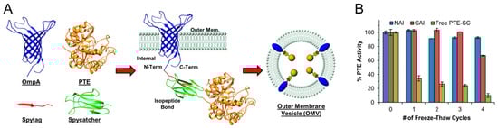 Engineered OMVs for bioremediation using SpyCatcher (SC)-SpyTag (ST) conjugation system. (A) Phosphotriesterase fused with SC was conjugated to OmpA fused with ST. (B) PTE in engineered OMVs survived multiple freeze–thaw cycles (−80 °C/room temperature) better than free PTE-SC (NAI = ST at N-terminus of OmpA, CAI = ST at C-terminus of OmpA, all with arabinose and IPTG in culture), as indicated by activity using paraoxon as substrate. PDB = 2GE4 (OmpA), 1PTA (PTE), 4MLI (SpyTag), and 4MLI (SpyCatcher). Adapted with permission from Ref. []. Copyright 2015 American Chemical Society [,,,,,,].