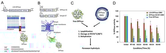 Engineered OMVs using two systems to encapsulate DPFase for bioremediation. (A) One strategy for encapsulating DFPase into OMVs was to use lipopeptide Lpp’ as an anchor and fuse this to DFPase with a linker. (B) Another strategy was to use OmpA as an answer and conjugate this to DFPase using the SC-ST system. (C) Schematic for testing thermal stability of DFPase encapsulated in OMVs using the two strategies compared to free DFPase. (D) OMV-encapsulated DFPase was more thermally stable than free DFPase. X-axis numbers are temperature (RT = room temperature) followed by hours of incubation. Error bars are standard deviation (n = 3) and * indicates p < 0.01 vs. free enzyme. Adapted with permission from Ref. []. Copyright 2022 American Chemical Society [,,,,,].
