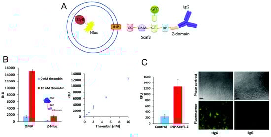 Engineered OMVs using scaffold for biosensing and bioimaging multiple targets. (A) Schematic of system. Nanoluciferase (Nluc) is fused to SlyB to anchor inside OMVS. A scaffold with three cohesion domains (CC, CT, and RF) and a cellulose-binding module (CBM) is fused to ice nucleation protein (INP) to display on OMV surface. At the end of this scaffold is an antibody-binding Z-domain that can conjugate to, for example, the IgG antibody displayed. Green fluorescent protein (GFP) is shown fused to a dockerin domain that can bind to a cohesion domain to illustrate the flexibility of the system for detection. (B) Thrombin is detected using OMVs as well as a control Z-domain-ELP-NLuc (only 1:1 signal amplification, where ELP = elastin-like-polypeptide moiety). (C) Demonstrating the flexibility of this system, HeLa cells were detected by OMVs with the scaffold, Z-domain, and bound GFP with 8× higher fluorescence than control OMVs expressing only SlyB-NLuc. Adapted with permission from Ref. [] Copyright 2017 Royal Society of Chemistry (https://doi.org/10.1039/C7CC04246A, accessed on 16 June 2023).