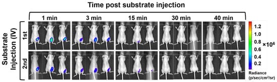 The use of NLuc in vivo as a subcutaneous implement can be an extraordinary tool for a variety of biomedical applications and is being investigated with some promising results []. Bioengineered OMVs co-expressing ATP-independent NanoLuc luciferase and IgG domain have been used to develop an immunoassay for detection of immunoglobulin IgG which had a comparable detection limit to that of the commercial IgG ELISA kit []. In a subsequent study, the multifunctional NLuc-encapsulated OMVs were tested for bioluminescence signals in a murine animal model, thereby exhibiting a strong potential for imaging-related biomedical application (Figure 8) []. In vitro cytotoxicity and ex vivo tissue histopathology demonstrated a good biocompatibility of the OMVs. In a more recent study, bioengineered vesicles were employed for optoacoustic imaging via encapsulation of the biopolymer melanin, mediated through expression of tyrosinase, a rate-limiting enzyme in melanin biosynthesis []. Although the research on the use of OMVs for biosensing and bioimaging is in its infancy, promising results indicate that they can emerge as valuable tools for these applications in vitro as well as in vivo.
