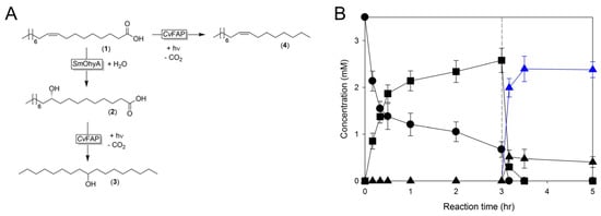 Transformation of unsaturated long-chain fatty acids with OMVs and biocatalysis. (A) Reaction scheme using enzymes Stenotrophomonas maltophilia fatty acid double-bond hydratase (SmOhyA) and Chlorella variabilis NC64A photoactivated decarboxylase (CvFAP). Substrate is oleic acid ((Z)-octadec-9-enoic acid, 1), intermediate is (R)-10-hydroxyoctadecanoic acid (2), and desired product of the 2-step pathway is 9-hydroxyheptadecane (3). (Z)-heptadec-8-ene (4) can be a product of CvFAP or a by-product of the 2-step pathway. (B) Reaction of oleic acid using engineered OMVs with SmOhyA and CvFAP. Concentrations of (1, closed circle), (2, closed square), (3, closed blue triangle), and (4, closed triangle) shown. Decarboxylation initiated with blue light at t = 3 h (dashed lines). Experiments were performed in triplicate and error bars are standard deviations. Adapted with permission from Ref. []. Copyright 2012 reference authors.