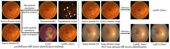 In recent years, with the development of deep learning, as shown in Figure 1a, several lesion identification models have been proposed to assist ophthalmologists in the diagnosis of DR. Models [,,,] trained with fine-grained annotations such as pixel-level annotations or bounding box annotations have been proposed and have achieved acceptable results in DR lesion identification. However, the application of these models is limited due to the time-consuming manual annotation. Therefore, some methods [,,] attempt to accomplish both DR grading and lesion identification using only coarse-grained annotations such as grading labels or lesion attribute labels. However, due to the limited supervision provided by coarse-grained annotations, these methods tend to be biased on the most important lesion regions while ignoring trivial lesion information. In addition, in clinical applications, image quality and imaging performance vary due to the different image acquisition equipment used in different healthcare facilities, the direct application of models on other datasets will suffer huge performance losses (Figure 1b), which greatly limits the flexibility and scalability of these deep learning methods.