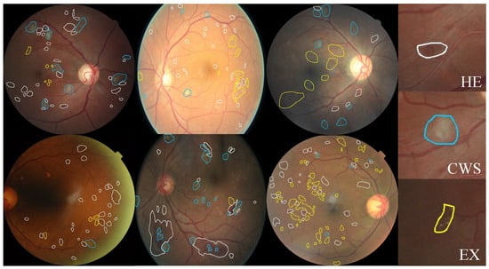 Examples of pixel level annotations from our EyePACS-Pexel dataset. White, blue and yellow indicate HE, CWS, and EX, respectively.