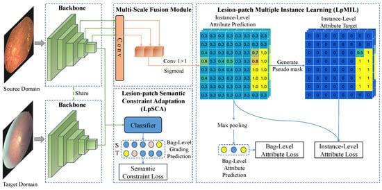 In Figure 3, the images are processed by fully convolutional networks including the backbone and the multi-scale fusion module to obtain patch-level classification predictions for each lesion. The number of patches is related to the size of the feature map, which is determined by the backbone and the input size. Given a set of source domain images with lesion attribute labels and grading labels and a set of target domain images with only grading labels . The purpose of LpMIL and LpSCA is to train the backbone network and the multi-scale fusion module to predict patch-level lesion attribute labels of and , respectively. To achieve this, we first extract the feature from the source domain image using the backbone, and then the last few layers of are fed into the multi-scale fusion module to fuse the feature maps of different scales, and finally, the LpMIL perform bag-level and instance-level supervision using lesion attribute labels , where bags and instances correspond to images and patches in the images, respectively. In a cross-medical institution scenario, that is, across different datasets, we use the same backbone to extract the feature from the target domain image, and then the LpSCA uses the grading labels and to perform domain adaptation on the last layer of and to improve cross-domain lesion identification performance. In the following subsection, we will describe the specific implementation of the above method in detail.