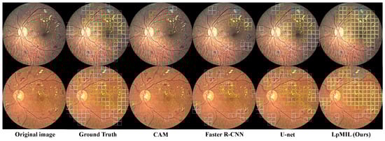 Figure 4 shows the qualitative results. We can observe that CAM can only identify a small number of lesions, ignoring the majority of lesions. U-net trained with pixel-level annotations can detect lesions in fundus images well, while Faster R-CNN trained with bounding box annotations detects lesions relatively accurate but not comprehensively. Although the identification performance is not as good as U-net, our model can detect most lesions in different regions, which also highlights the superiority of our LpMIL.