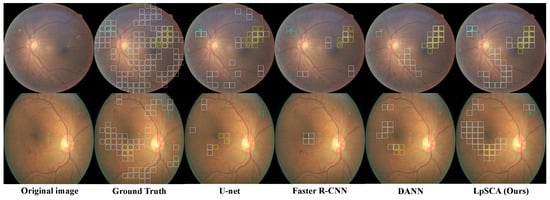Figure 5 shows the qualitative results. We can see that, unlike DANN, our LpSCA can correctly identify CWS, which illustrates that the prior information provided by our semantic constraint adaptation method drives the backbone to learn better lesion features. Compared with U-net and Faster R-CNN, our LpSCA can identify more lesions, which demonstrates the effectiveness of our LpSCA.