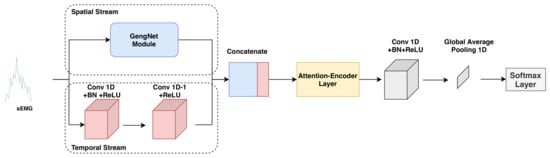 In the field of image classification, 2D convolutional layers that apply multiple filters, each with different weights, can learn to extract different types of spatial information from images []. On the other hand, 1D convolutional layers are mainly used to extract temporal information from time-series signals, such as audio and speech [,]. In our network sEMGXCM, two streams that use 2D and 1D convolutional layers, respectively, to extract spatial and temporal features. In contrast, GengNet only uses 2D convolutional layers and XceptionTime only for 1D convolutional layers. Therefore, sEMGXCM can make use of both spatial and temporal information from the input sEMG signals. In addition to XCM [], a self-attention layer is added to learn the information across different electrodes or time steps.