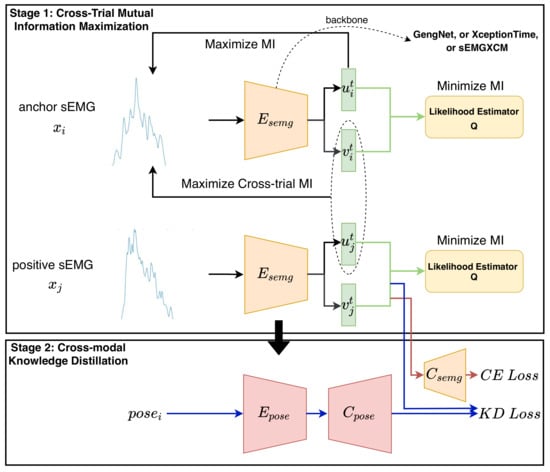 In this subsection, we present a novel two-stage training scheme to enhance the networks for sEMG-based gesture recognition. As an instance of hybridization engineering [], this training scheme (called sEMGPoseMIM, shown in Figure 2) is inspired by mutual information across different trials, as well as the inherent relationship between sEMG signals and hand movements. Specifically, we aim to generate trial-invariant representations from sEMG signals via maximizing cross-trial mutual information in the first stage. In the second stage, the initialized model is fine-tuned via cross-modal learning with another modality (i.e., hand movements).