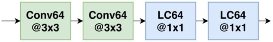 The architecture of the GengNet Module in the network sEMGXCM. Conv and LC, respectively, denote the 2D convolutional layer and 2D locally connected layer. The number following the layer name and the number after the ampersand denote the number of filters and the convolutional kernel size, respectively.