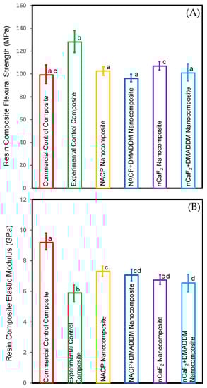 Composite mechanical properties: (A) flexural strength, and (B) elastic modulus (mean ± sd; n = 6). Incorporating DMADDM with nCaF2 or NACP into an L.S.S. nanocomposite did not compromise the flexural strength compared to commercial control composite (p > 0.05). Incorporating nCaF2 or NACP with DMADDM did not compromise the elastic modulus compared to the experimental control composite (p < 0.05). Dissimilar letters represent values that are significantly different from each other (p < 0.05).