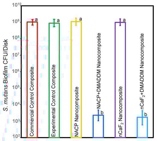 CFU of S. mutans biofilms on composites (mean ± sd; n = 6). The nCaF2 nanocomposite, NACP nanocomposite, and control composite had the highest biofilm growth. DMADDM inhibited S. mutans biofilm growth by 6 logs compared to commercial control composite (p < 0.05). Dissimilar letters represent values that are significantly different from each other (p < 0.05).
