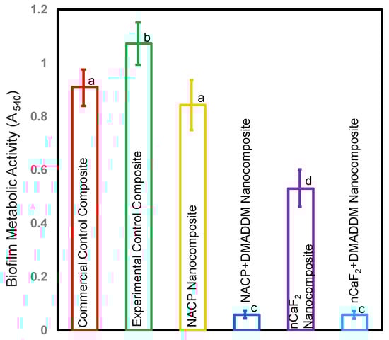 Metabolic activity of biofilms on composites after two days (mean ± sd; n = 6). Incorporating DMADDM with either nCaF2 or NACP into an L.S.S. nanocomposite diminished the metabolic function of S. mutans by over 90% compared with other groups (p < 0.05). Different letters represent data that are significantly different from each other (p < 0.05).